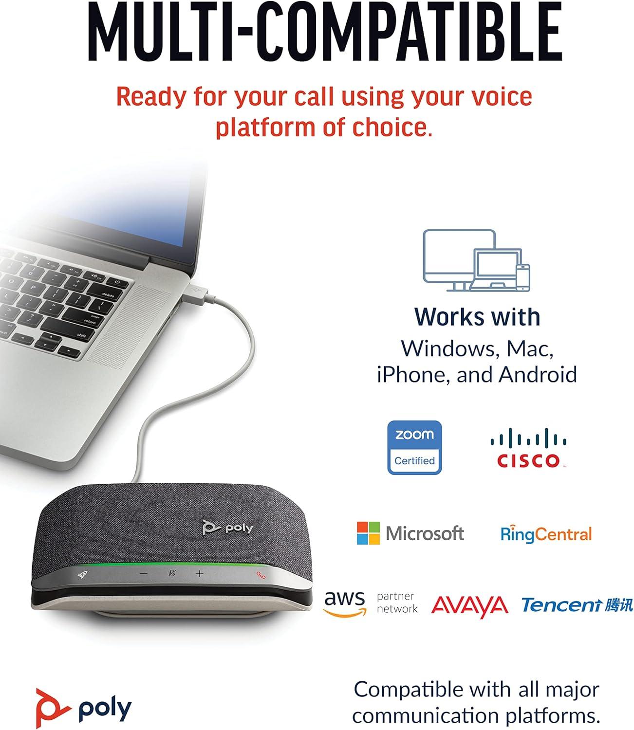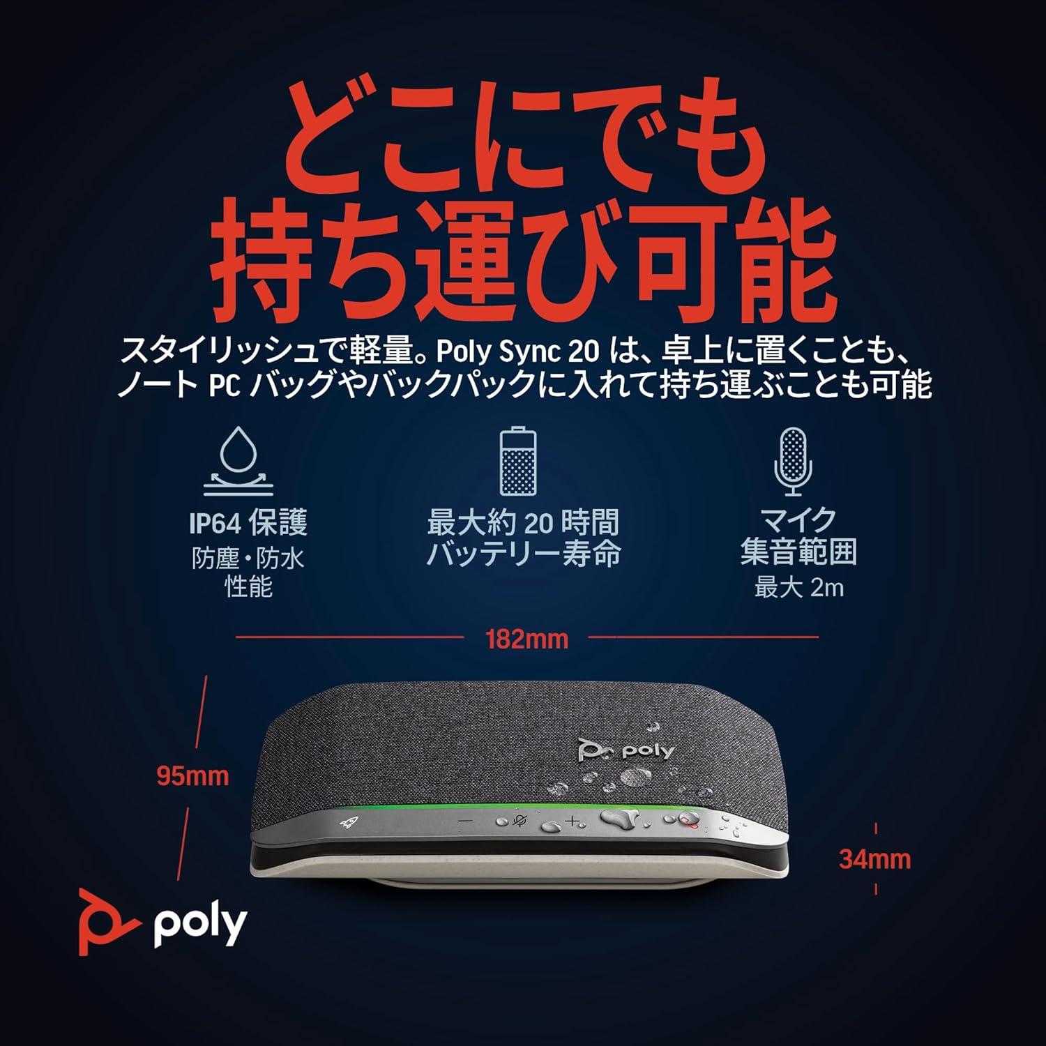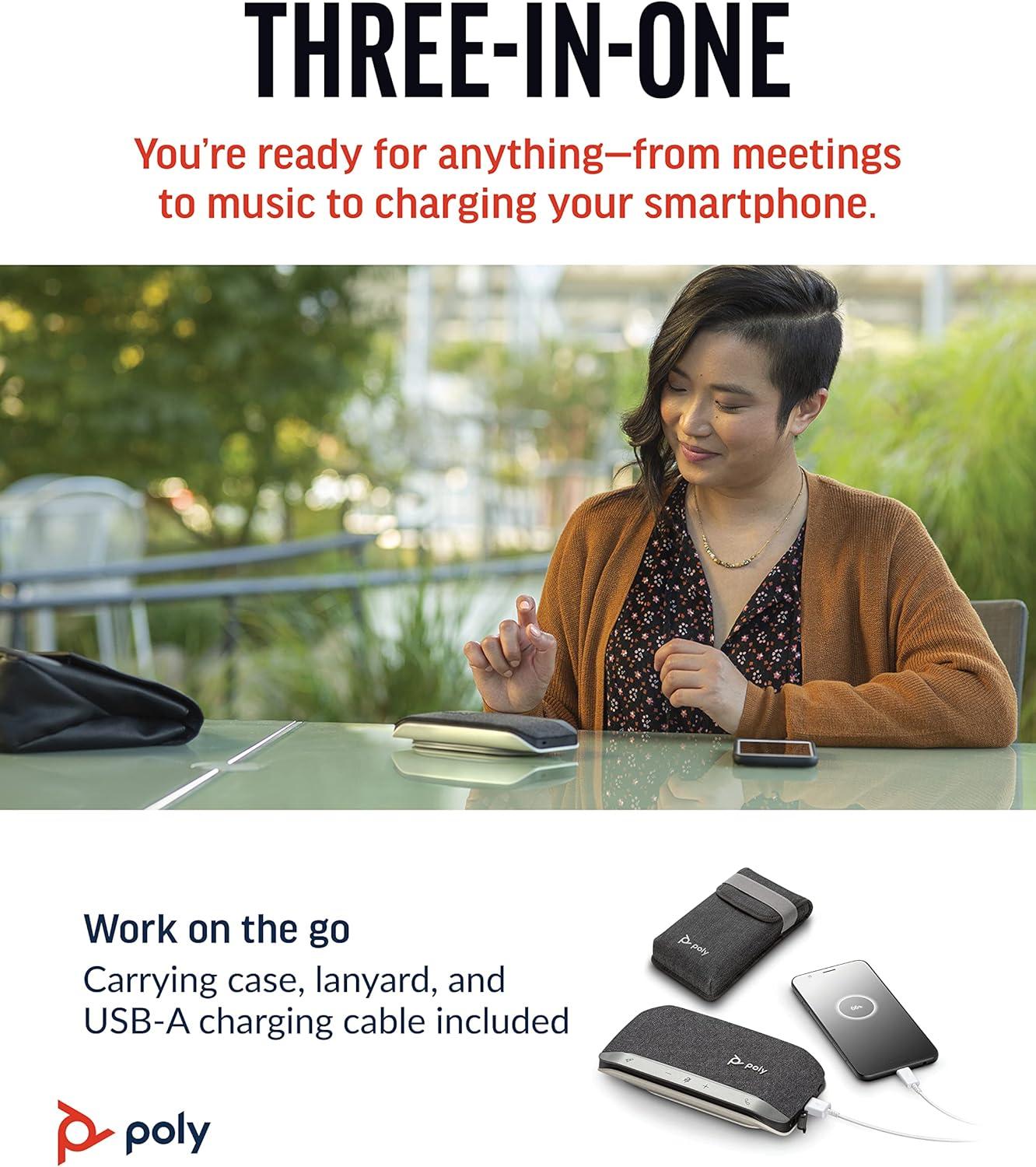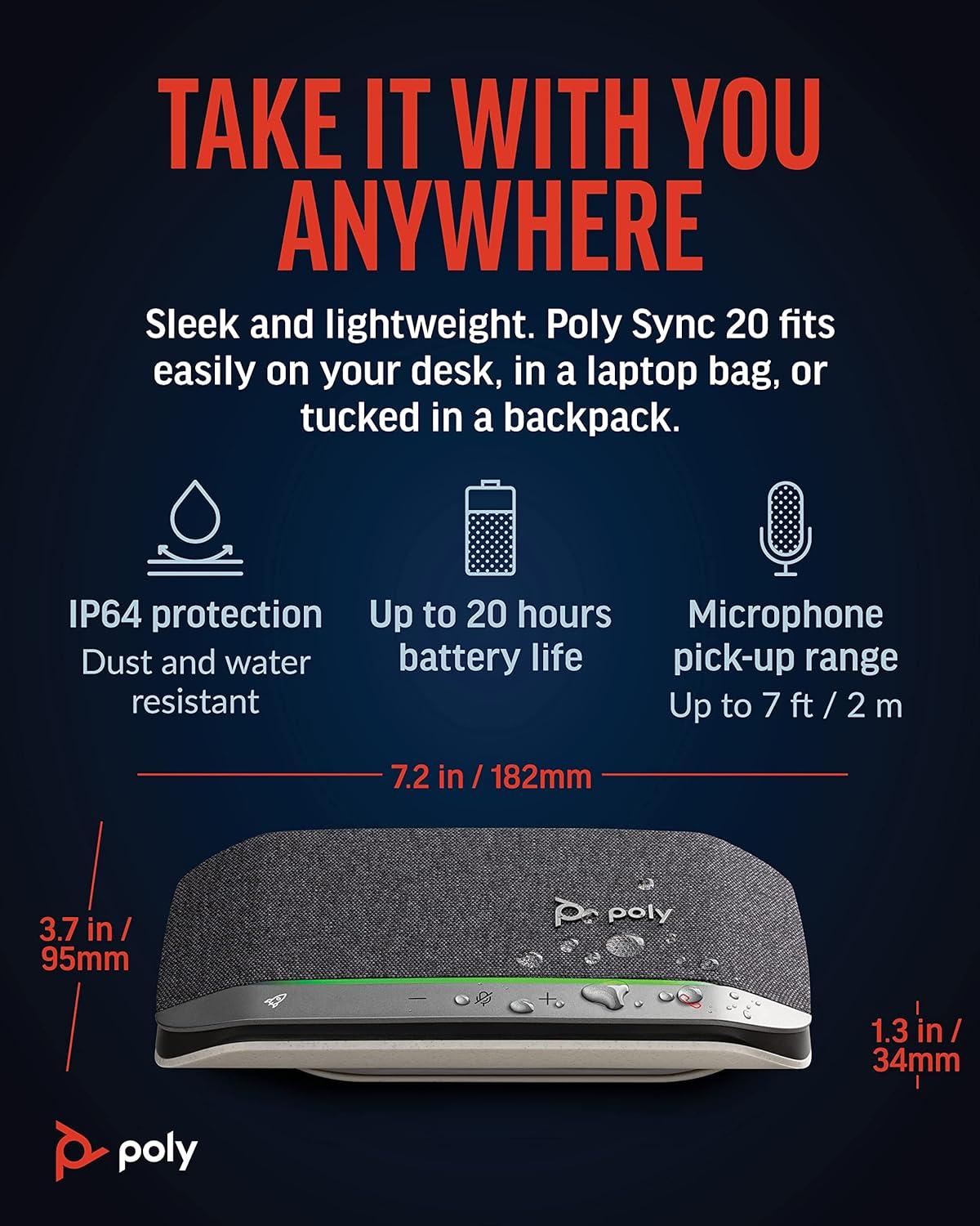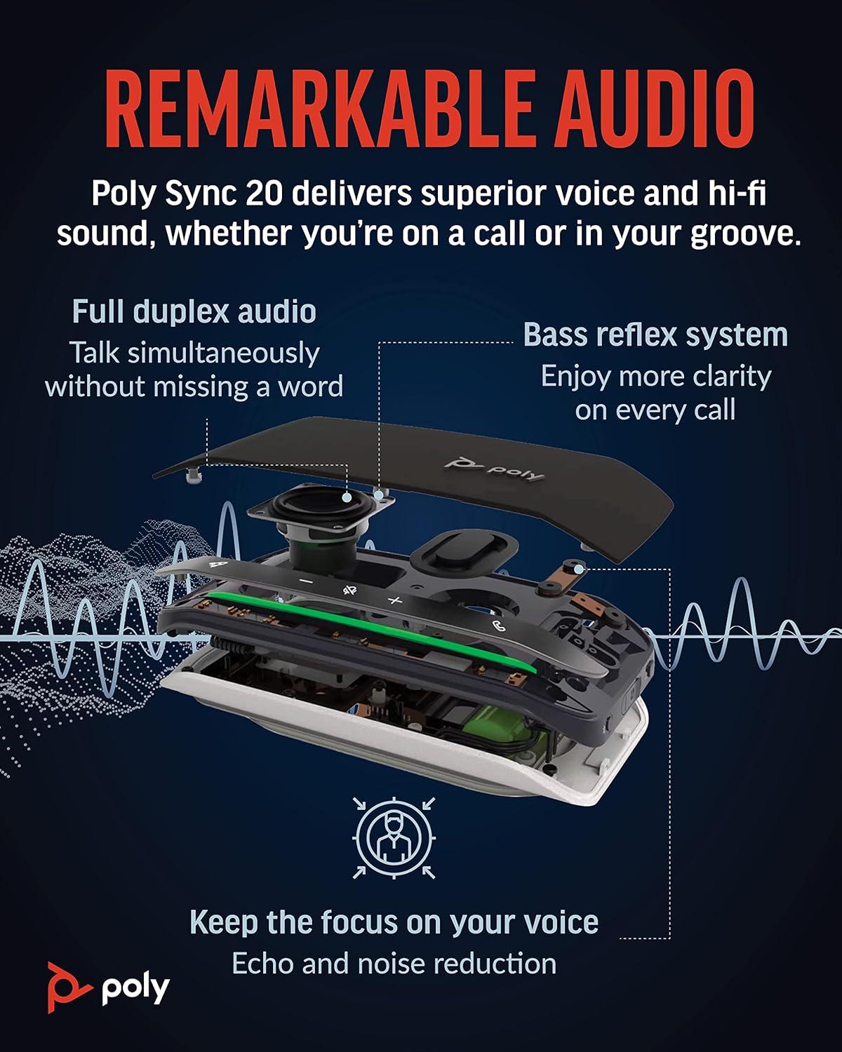 Let’s face it: the audio on your laptop speaker and smartphone isn’t great. Sound like the professional you are with the Poly Sync 20 USB/Bluetooth speakerphone for remarkable conference calls and music anywhere. With its sleek, modern design and more than 20 hours of battery life, this personal Bluetooth and USB speakerphone is IP64 dust and water-resistant and comes with its own carrying case—perfect for working on the go all day long. It can even charge your smartphone!   Zoom certified and compatible with Microsoft Teams and other conferencing platforms, the Poly Sync 20 portable speakerphone for conference calls features an array of smart features that let you hear and be heard. A three-microphone steerable array for echo and noise reduction keeps the focus on your voice, not the background noise, while full duplex audio enables natural, simultaneous conversations without missing a word. Enjoy more clarity on every call thanks to the bass reflex system with dual passive radiators for natural voice and deep bass.   More than just a portable speakerphone, the Poly Sync 20 also delivers multimedia quality sound that is a music-lover’s delight. This personal Bluetooth speakerphone for computer and mobile devices lets you connect the way you want. Simply connect your smartphone or tablet wirelessly using Bluetooth or to a PC/Mac via USB-A for a wired connection. Easy to use, the Poly Sync 20 features a programmable button that lets you quickly access your favorite functions, including play/pause music, last-number redial, voice assistant, and more. The highly visible light bar lets you view the call status, even from across the room.